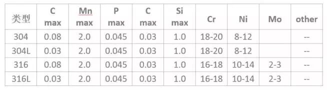 不銹鋼:耐空氣、蒸汽、水等弱腐蝕介質(zhì)或具有不銹性的鋼種。通常使用的鋼種為304、304L、316、 316L,是奧氏體不銹鋼的300系列鋼。